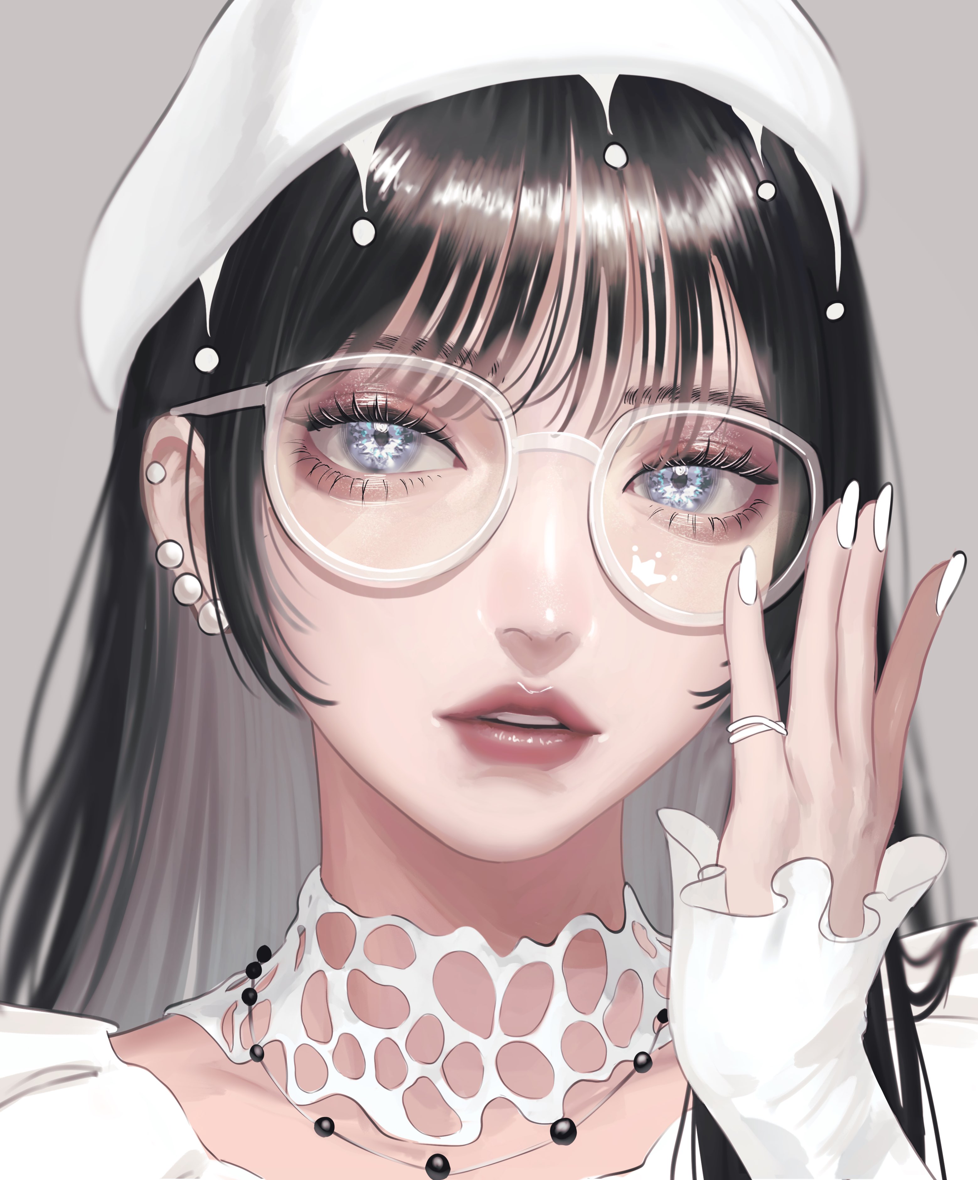 1girladjusting eyewearberetblack hairblue eyeschoppy bangsearringsfingernailsgrey backgroundhatjewelrylong hairlong sleeveslooking at viewernail polishnecklacepink lipsportraitringsidelockssimple backgroundsolostud earringsthick lipswhite hatwhite nailswhite-framed eyewear