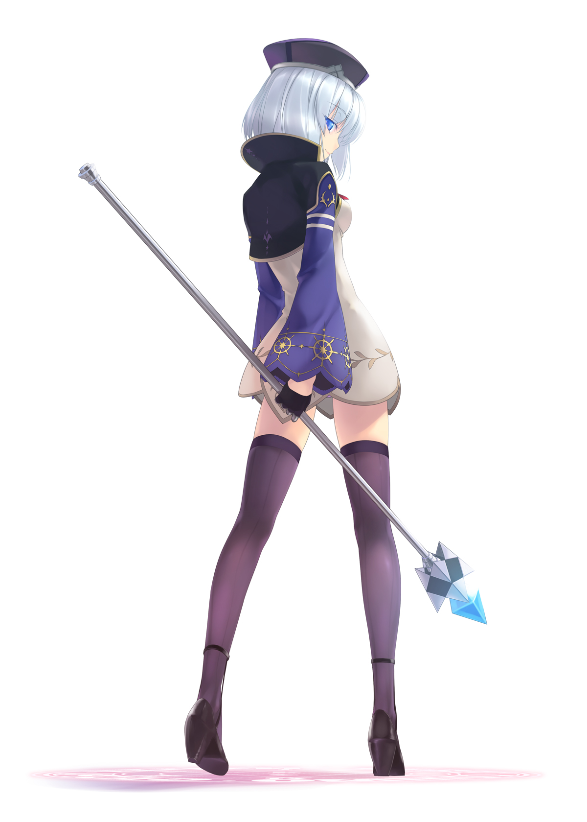 1girlankle strapblue eyesbreastsfemale focusfrom behindfull bodyhatheel uphigh heelslooking backshoessmall breastssmilesolostaffstandingstrappy heelsthighhighszettai ryouiki