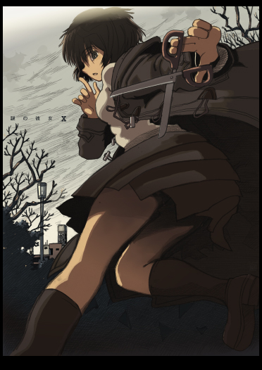 1girlblack hairblack socksblue eyesfemale focushoodhooded jacketjacketkneehighsloaferspleated skirtscissorsshoesshort hairskirtsockssolo