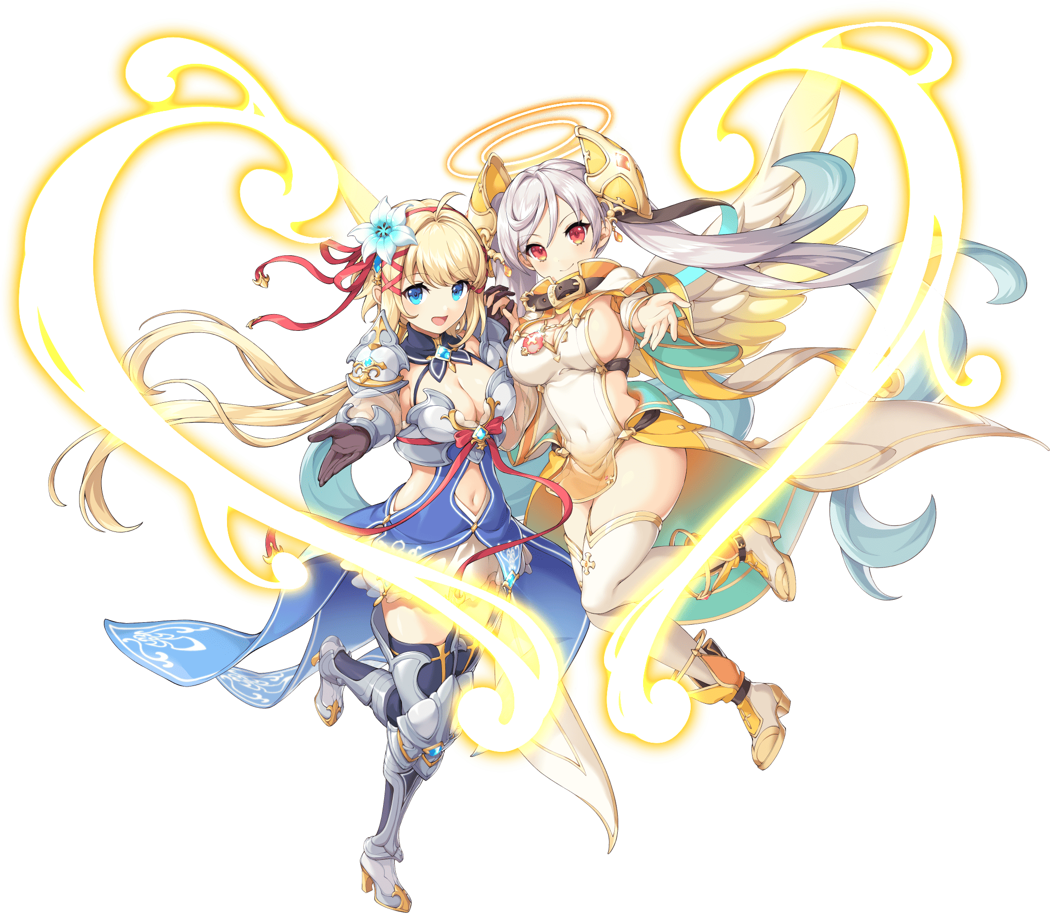 2girlsarmorbare hipsblonde hairblue eyesbreastscleavageclothing cutoutcovered navelcrossfeathered wingsflowerfull bodygloveshair flowerhair ornamenthalohigh heelsjewelrylight smilemultiple girlsnavel cutoutnecklaceopen handopen mouthreachingreaching towards viewerred eyesshoulder armorsideboobsolostandingstanding on one legtransparent backgroundtwintailswhite hairwings
