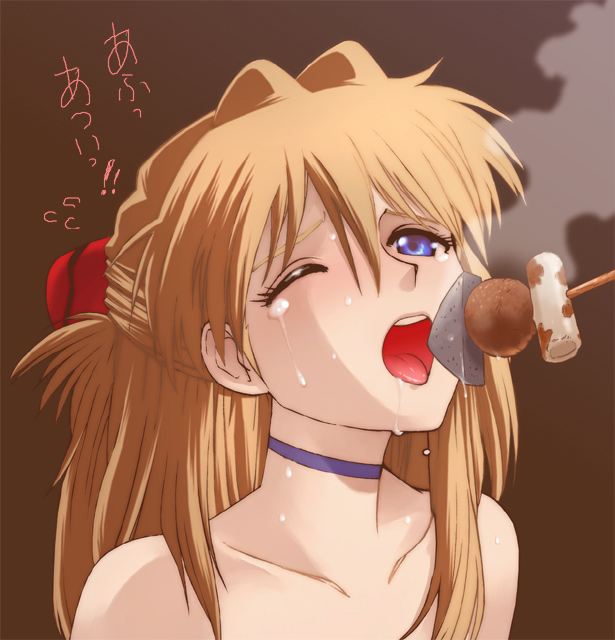 1girlbare shouldersblue eyesbrown hairchikuwachokercollarboneeatingfeedingfemale focusfoodforce-feedingforcedkonnyaku (food)odenopen mouthportraitsalivasexually suggestivesimple backgroundsolosweattearstonguewince