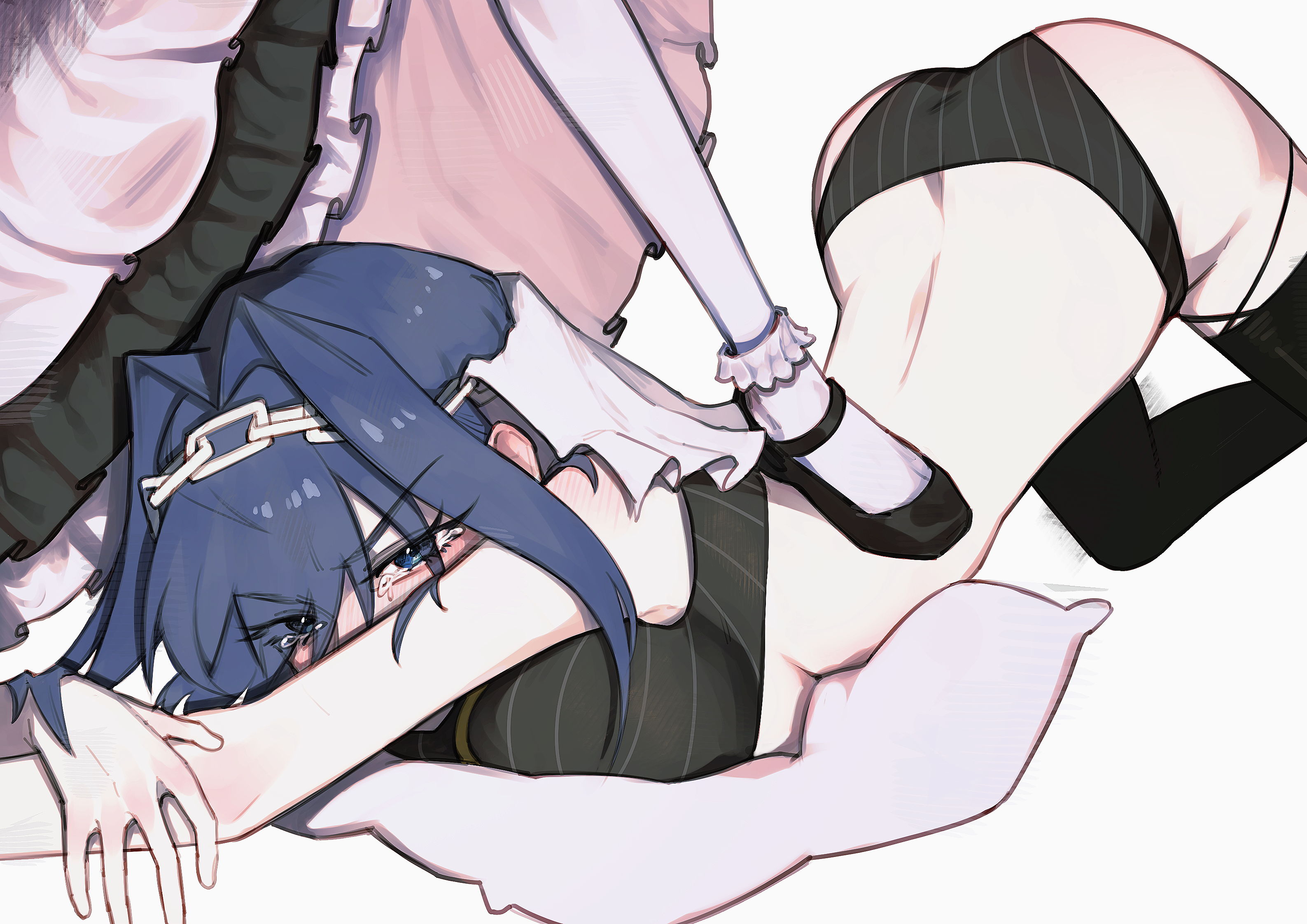 2girlsapronassbikiniblack bikiniblack dressblack thighhighsblue eyesblue hairblushbreastschainchain headbandcryingcrying with eyes opendresshair intakeslarge breastslooking at viewermary janesmedian furrowmultiple girlspantyhosepillowshoesstepped onswimsuittearsthighhighstop-down bottom-upunderboobveilvirtual youtuberwhite apronwhite pantyhose