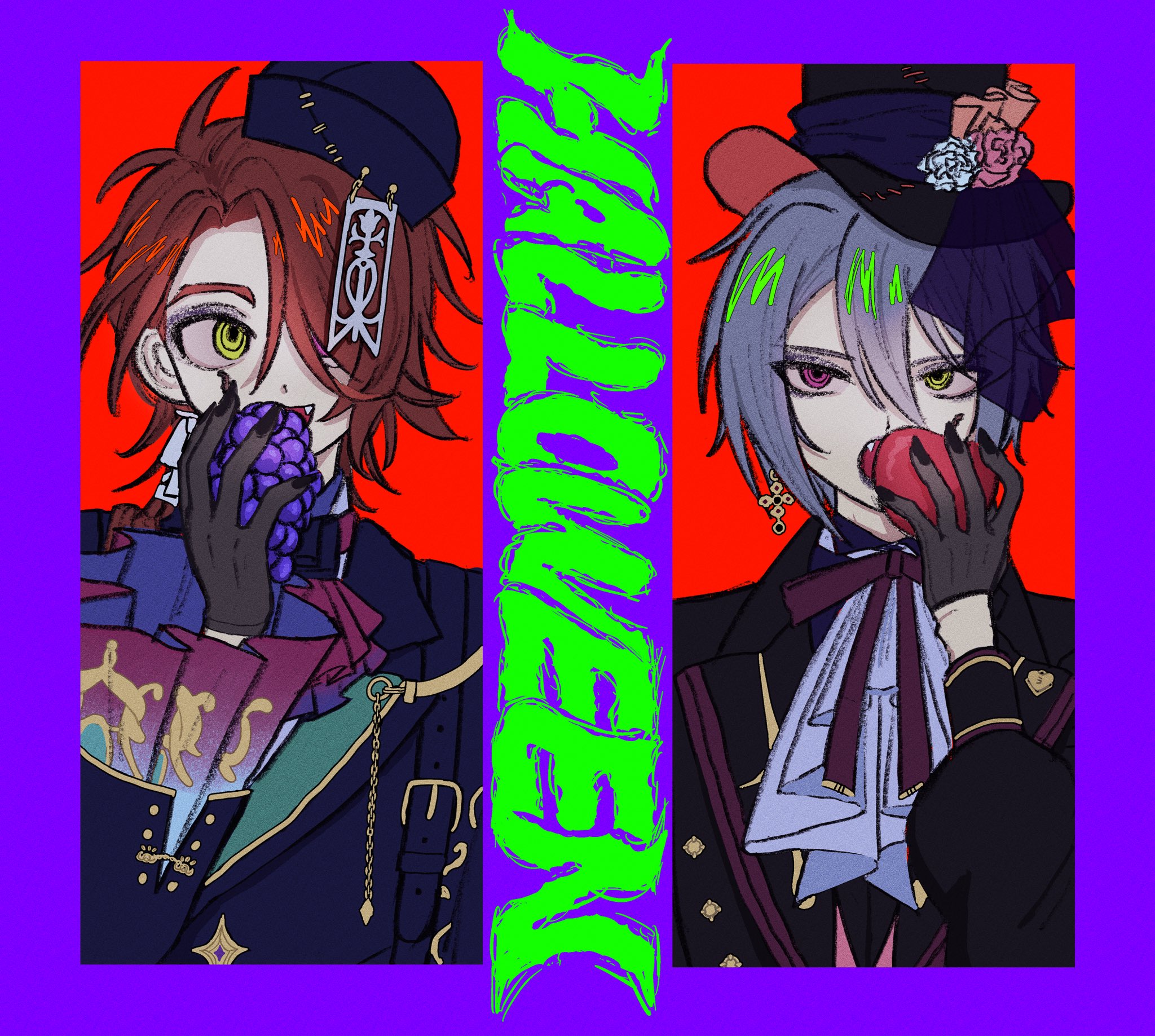 2boysappleascotblack glovesblack nailsborderearringseatingflowerfoodfruitglovesgrapesgrey hairhair between eyeshair over one eyehatheterochromiaholdingholding foodholding fruitjacketjewelrylong sleeveslooking at viewermale focusmultiple boysopen mouthouji fashionpink flowerpurple backgroundred backgroundred eyesred hairroseshort hairupper bodyyellow eyes