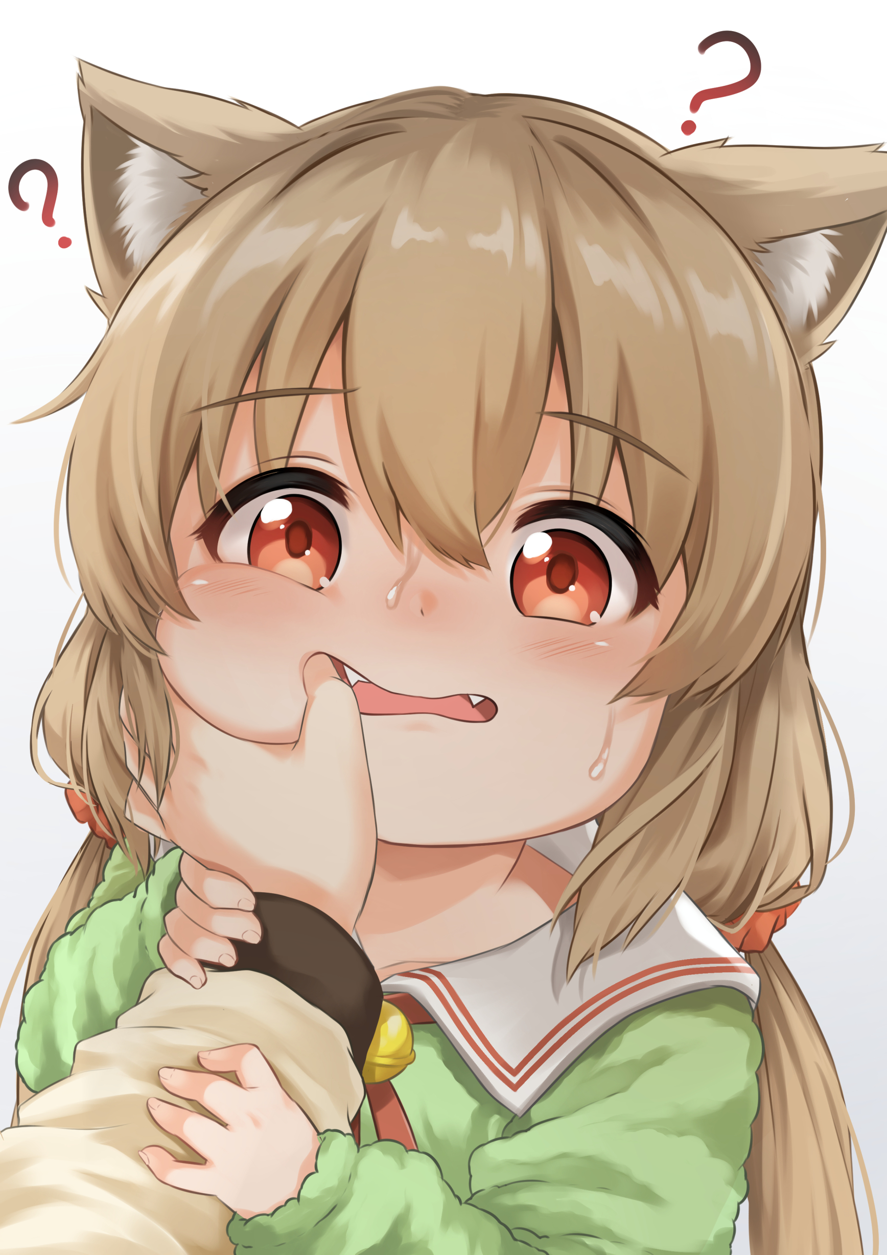 1boy1girlanimal ear fluffanimal earsbellbrown hairchubby cheekscollared shirtdisembodied handfangsfinger in another's mouthgreen shirthand on another's cheekhand on another's facejingle belllong hairlow twintailsneck bellopen mouthorange scrunchiered eyesscrunchieshirtsweattonguetwintailswhite background