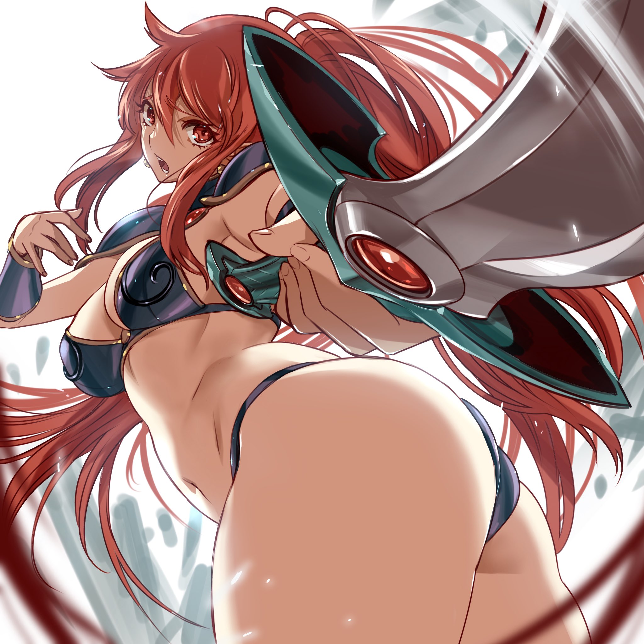 1girlarched backarmorbikinibikini armorblack bikinibracerbreastscleavageearringsfrom sideholdingholding swordholding weaponjewelrylong hairlooking backmedium breastsnavelopen mouthpauldronsperspectivepointing melee weaponpointing swordponytailred eyesred hairshoulder armorsidelockssoloswimsuitswordthick thighsthighsweaponwhite background