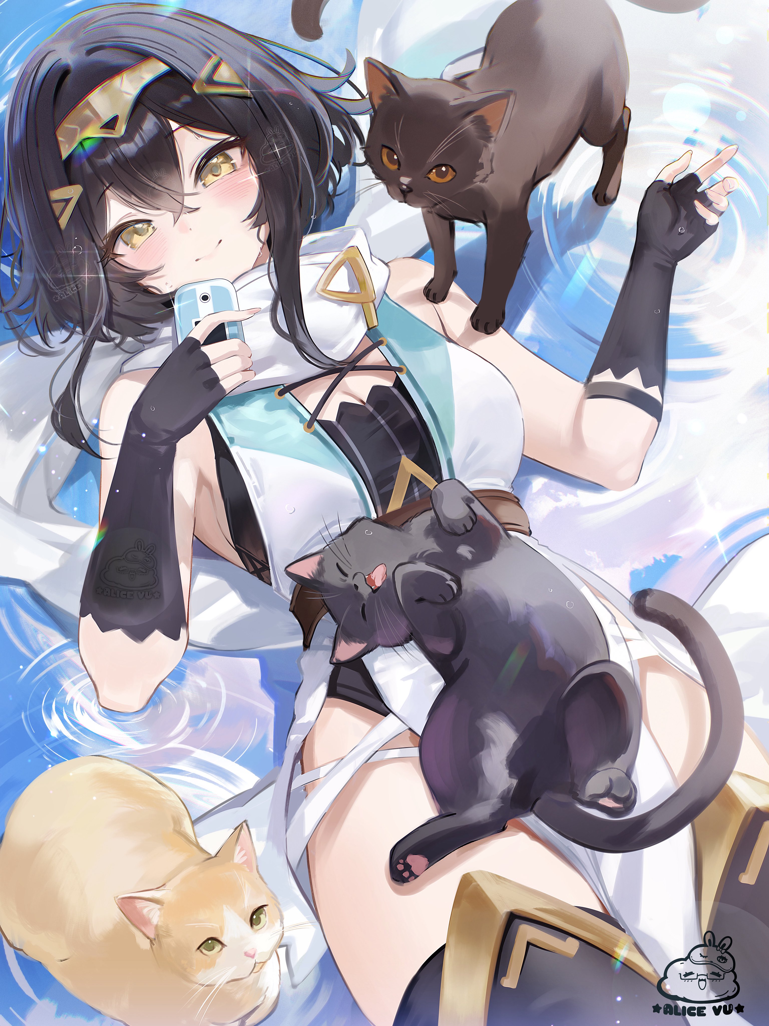 1girlbare shouldersblack catblack glovesblack leotardblack thighhighsblushbreastsbrown catcatcellphonecleavageclosed mouthcrossed bangselbow glovesglovesgreen eyeshair between eyeshand upholdingholding phoneleotardlooking at viewermedium breastsnose blushpelvic curtainphoneshort hairsmartphonesmilesparklesparkling aurathighhighsthighs
