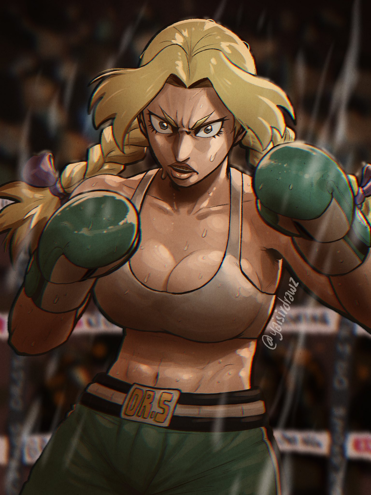 1girlblonde hairblurryblurry backgroundbowboxingboxing glovesbraidbreastscleavagecowboy shoteyelasheshair bowlarge breastslong hairlooking at viewermidriffmotion linesnavelparted bangsparted lipsseriousshortssignaturesolosports brasweattonedtoned femaletwin braids