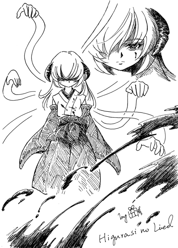 bloodcrossoverdetached sleevesgreyscalehornsjapanese clotheslong hairmikomonochromeparodyvectors