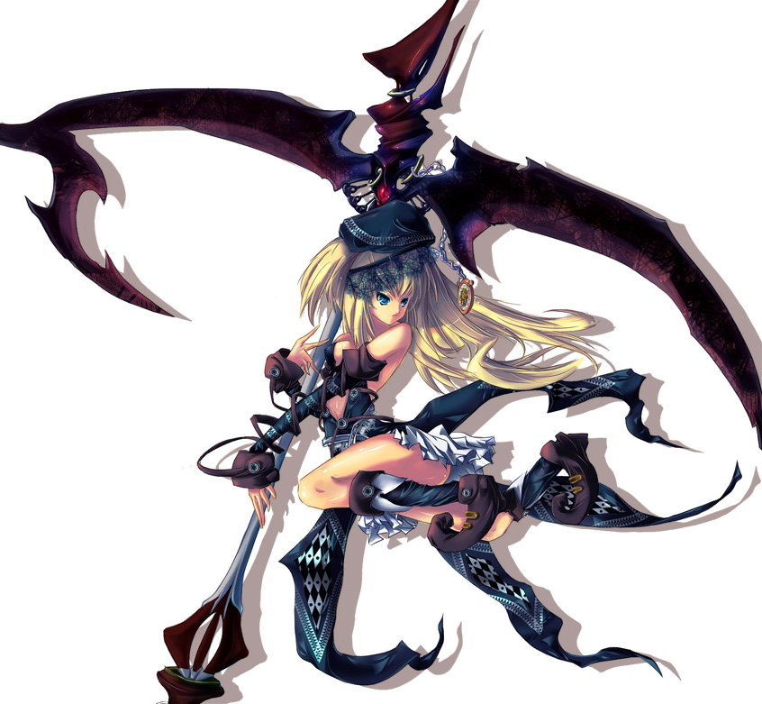1girlblonde hairblue eyesbootsbreastsdetached sleeveselbow glovesfemale focusgloveshathuge weaponlong hairmedium breastsminiskirtscythesideboobskirtsoloweapon