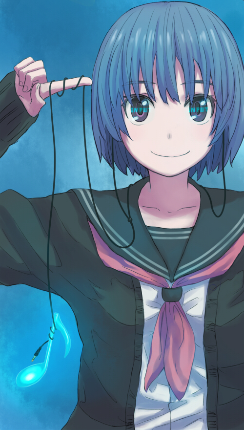 1girlblue eyesblue haircablecardiganfemale focusheterochromiamatching hair/eyesmusical notepurple eyesquaverschool uniformserafukushort hairsmilesolowire
