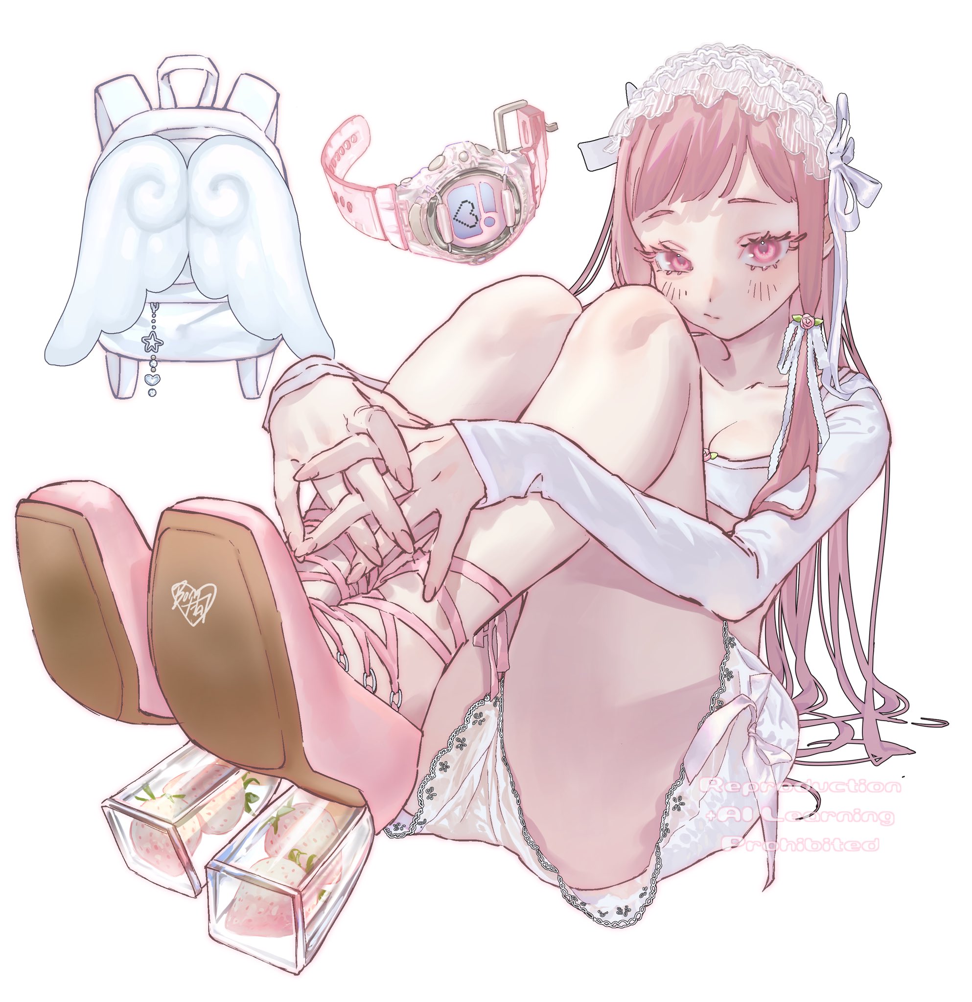 1girlangel wingsankle lace-upassbackpackbagblushbreastsclosed mouthcrop topfoodfruitg-shockhigh heelsinterlocked fingersknees uplace trimlong hairlong sleeveslooking at viewerpink eyespink hairpink shoesribbonsee-through clothessee-through footwearshoe solesshoesshortssimple backgroundsmall breastssolostrawberryswept bangswatchwhite backgroundwhite shortswingswristwatch