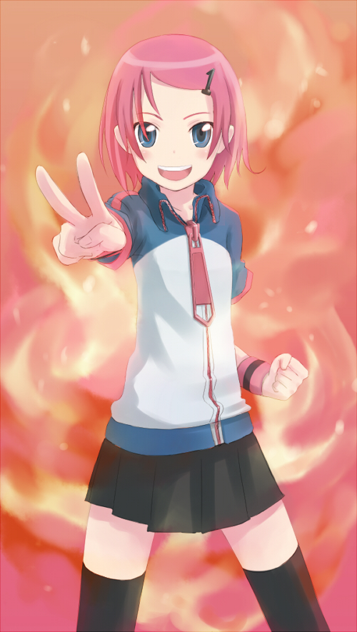 black thighhighsblue eyesclenched handhair ornamentjacketminiskirtpink hairshort hairskirtsmilesolothighhighsvwristbandzettai ryouikizipper
