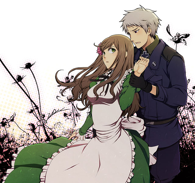00s1boy1girlapronbrown haircoupledressflowergloveshair flowerhair ornamentheteroholding another's wristlong hairmaidmaid apronmilitarymilitary uniformwhite hair