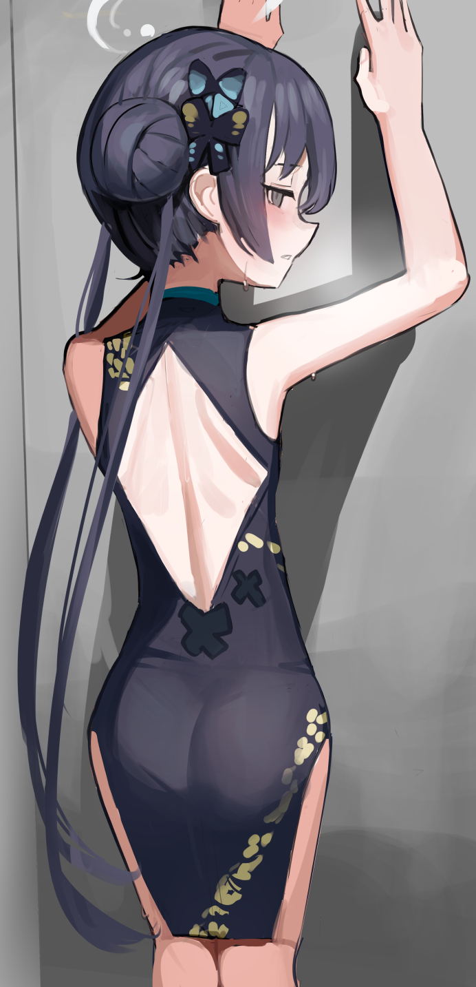 1girlassblack dressblack hairblushbreastsbutterfly hair ornamentclosed mouthdouble bundressgrey eyeshair bunhair ornamenthalolong hairlooking at viewersleevelesssleeveless dresssmall breaststwintailsvery long hairvirtual youtuber