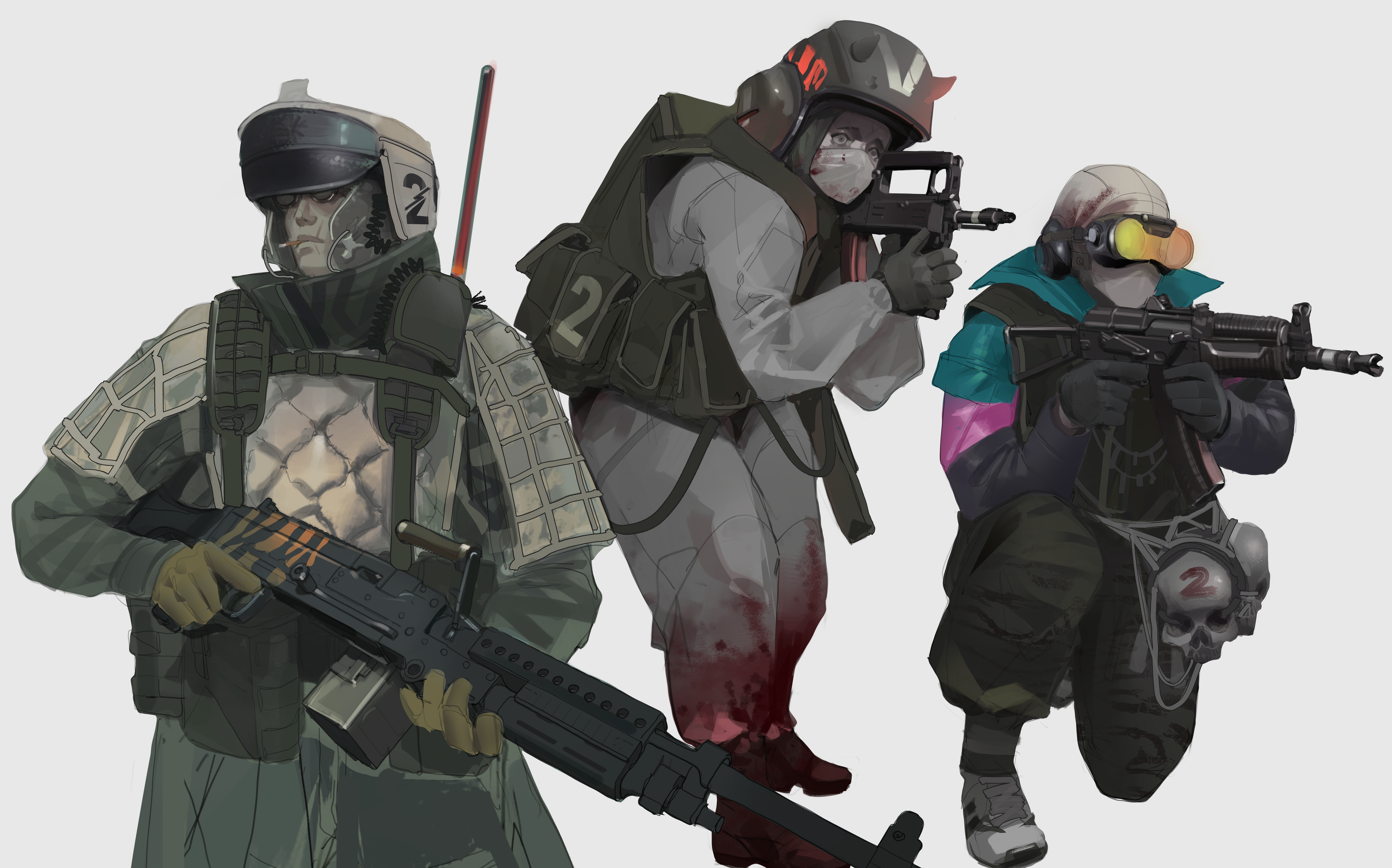 3boysbloodblood on clothescigarettegogglesgunholdingholding gunholding weaponmaskmouth maskmultiple boyssimple backgroundskullweapon