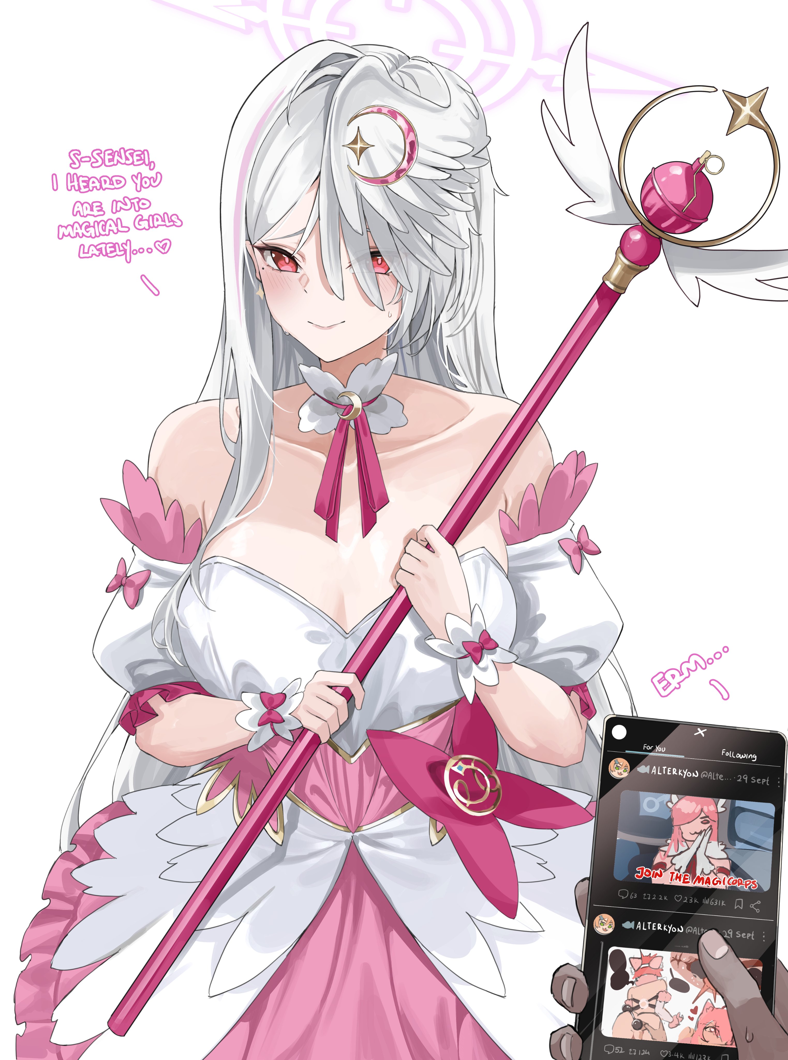 1boy1girlanalanal object insertionassbare shouldersblushborrowed characterbreastscrescentcrescent hair ornamentdetached sleevesdresshair ornamenthalohead wingsholdingholding phoneholding staffjuxtapositionlong hairmage staffmagical boymagical girlobject insertionofficial alternate costumephonepink dresspovpov handsred eyessingle head wingsolostafftadakuni (alterkyon)trapvery long hairwar of the worlds (2025)white hairwings