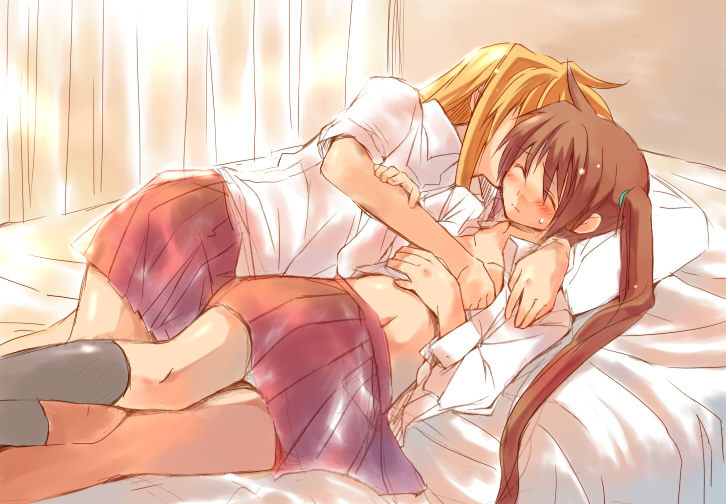 00s2girlsbedblonde hairblushbrown hairclosed eyeslong hairmultiple girlsside ponytailskirtundressingyuri