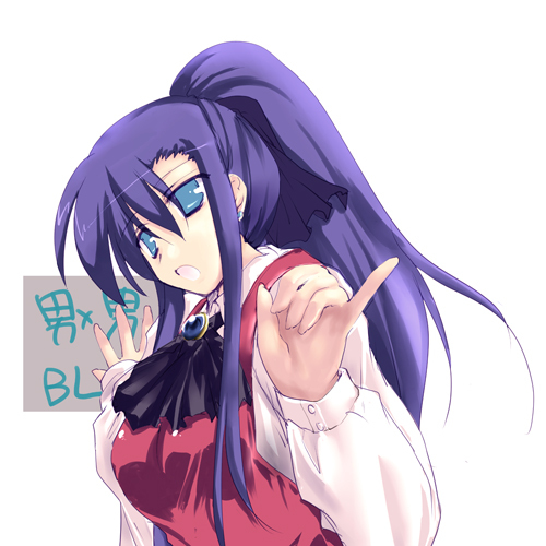 kousaki rui, original, 1girl, ahoge, arm up, blonde hair, breasts, female focus, fingerless gloves, gloves, hairband, large breasts, pants, purple eyes, smile, solo, text background, underboob