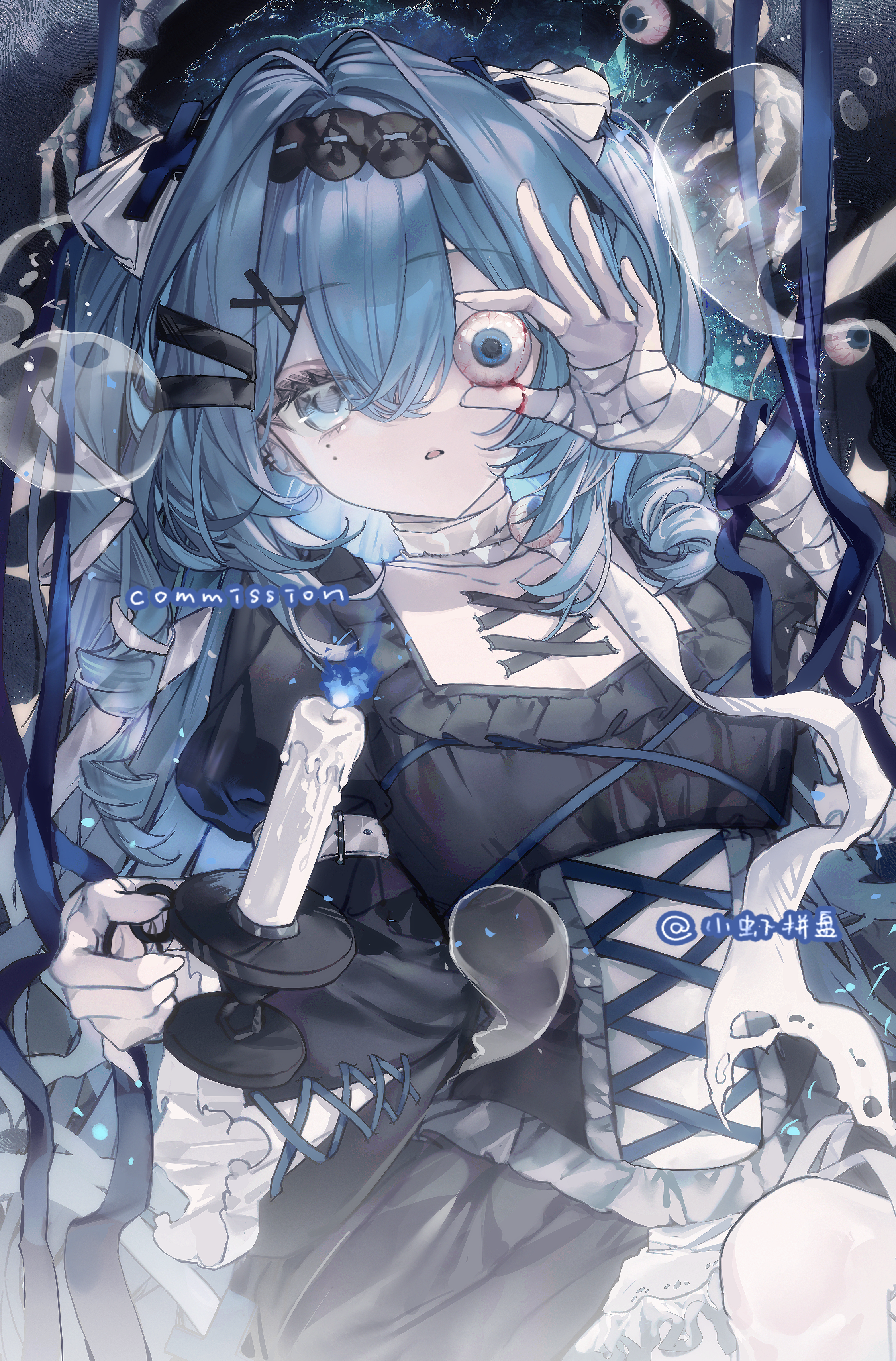 1girlartist namebandaged armbandagesblack dressblack hairbandblue eyesblue hairbreastscandlecleavagedouble-parted bangsdresseyeballfrilled sleevesfrillshair between eyeshair intakeshair ornamenthairbandholdingholding candleholding eyeballlong hairlong sleevesparted lipssoloupper bodyx hair ornamentxiao xia pin pan