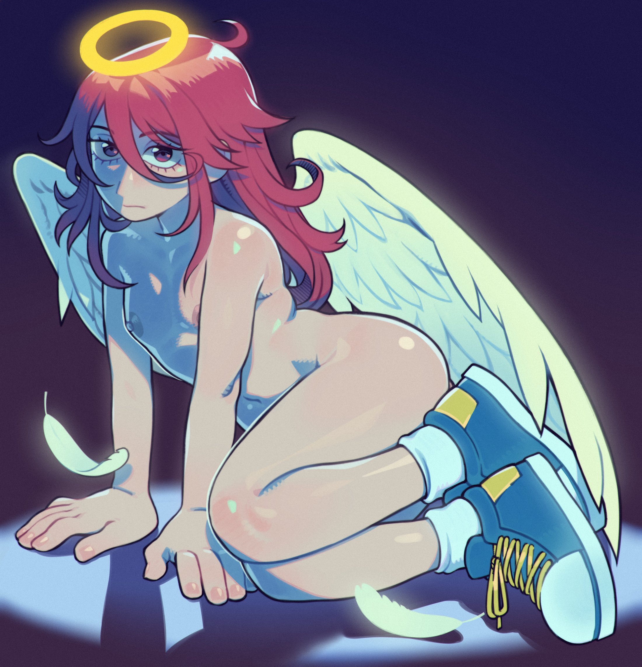1boyangel wingshalolong hairmale focusnudered hairshadowshoessimple backgroundsittingsneakerssolotraditional halotrapwhite wingswings