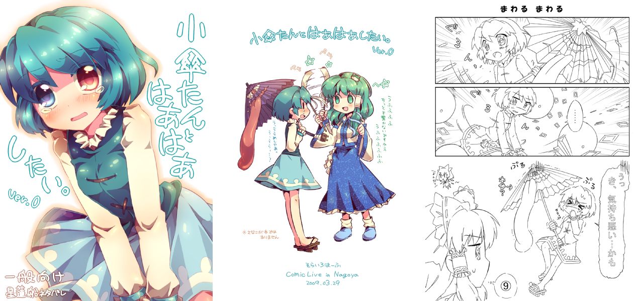 5girlsblue eyesblue hairbowcircled 9detached sleevesfemale focusfroggetagoheigreen eyesgreen hairhair bowheterochromiajapanese clotheskarakasa obakemikomultiple girlsred eyessandalsshort hairsnaketearstongueumbrellawings遶ュ・ィ