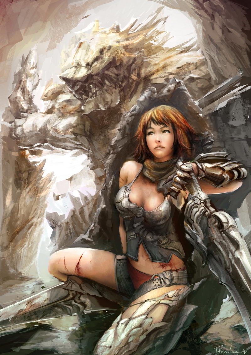 1girlarmorbare shouldersbloodbreastsbrown haircleavageinjurylarge breastslipsmonsternavelpantiesscarfshort hairswordunderwearweapon