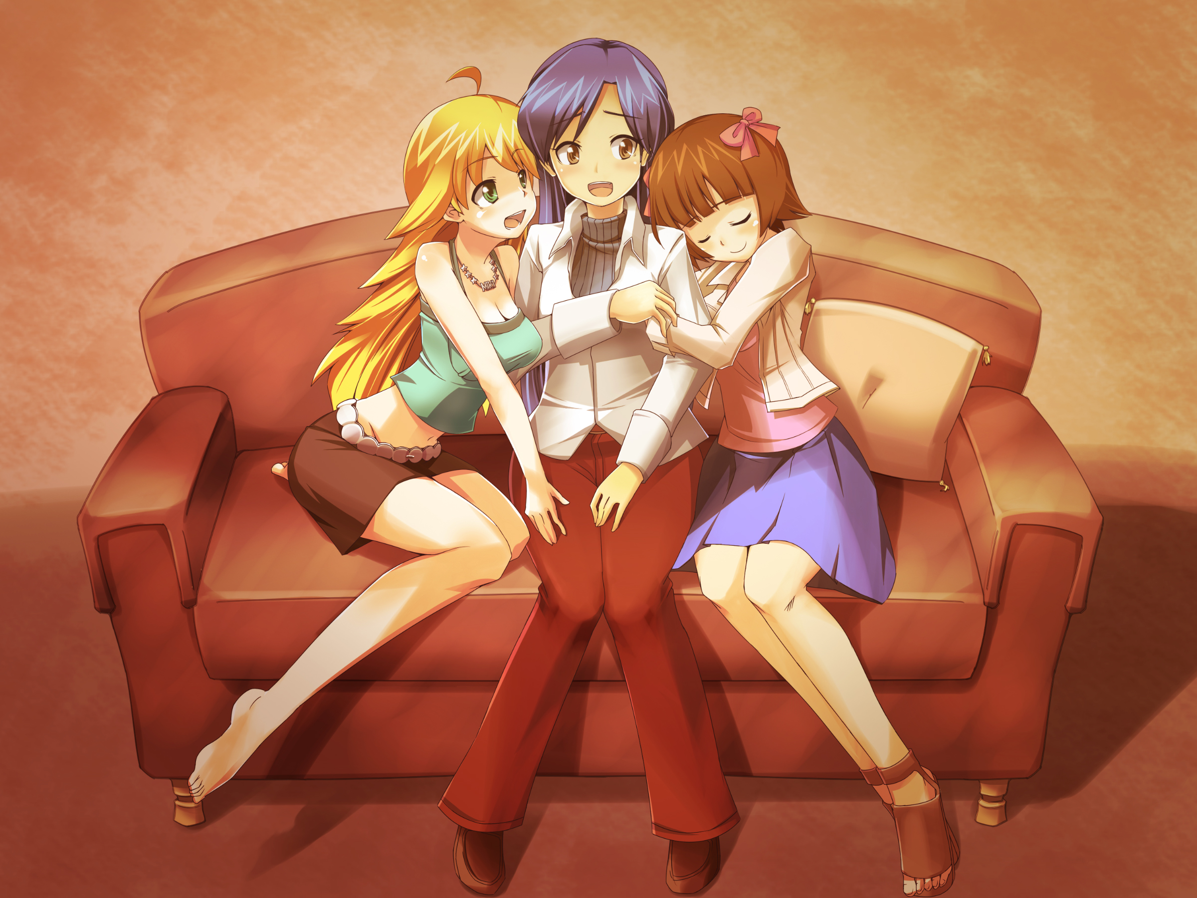 ouma tokiichi, arcueid brunestud, arima miyako, ciel (tsukihime), hisui (tsukihime), kohaku (tsukihime), len (tsukihime), nanako, nanako (tsukihime), sion eltnam (type-moon), sion eltnam atlasia, tohno akiha, yumizuka satsuki, melty blood, tsukihime, habit, hands on shoulders, 00s, 6+girls, ^^^, ascot, bare shoulders, beret, blonde hair, blue eyes, blue hair, book, bow, braid, breasts, brown hair, carrying, cat, chinese clothes, crossed arms, day, detached sleeves, dog tail, earrings, flying, flying kick, glasses, hair bow, hairband, hat, holding, hug, hug from behind, jewelry, kicking, large breasts, long hair, long skirt, looking at viewer, looking down, maid, miniskirt, moon, multiple girls, neck ribbon, pleated skirt, pointy ears, purple hair, purple skirt, red eyes, red hair, ribbon, school uniform, shirt, short hair, shoulder carry, siblings, single braid, sisters, skirt, sky, smile, sweater, tail, twins, very long hair