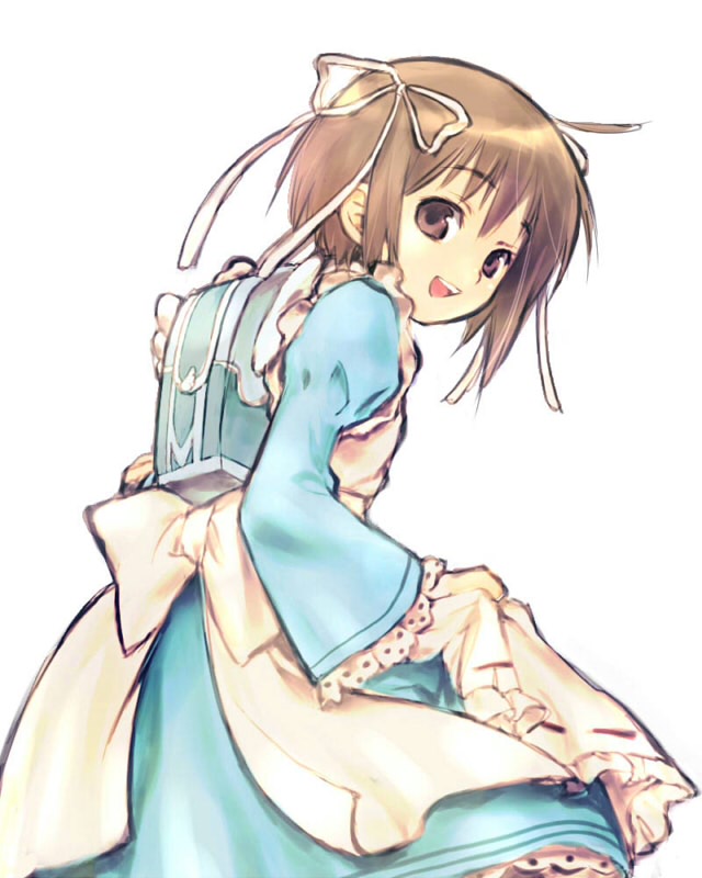 1girlapronbackpackbagbrown eyesbrown hairfemale focushair ribbonlooking backmaidmaid apronrandoseruribbonshort hairskirtsolo
