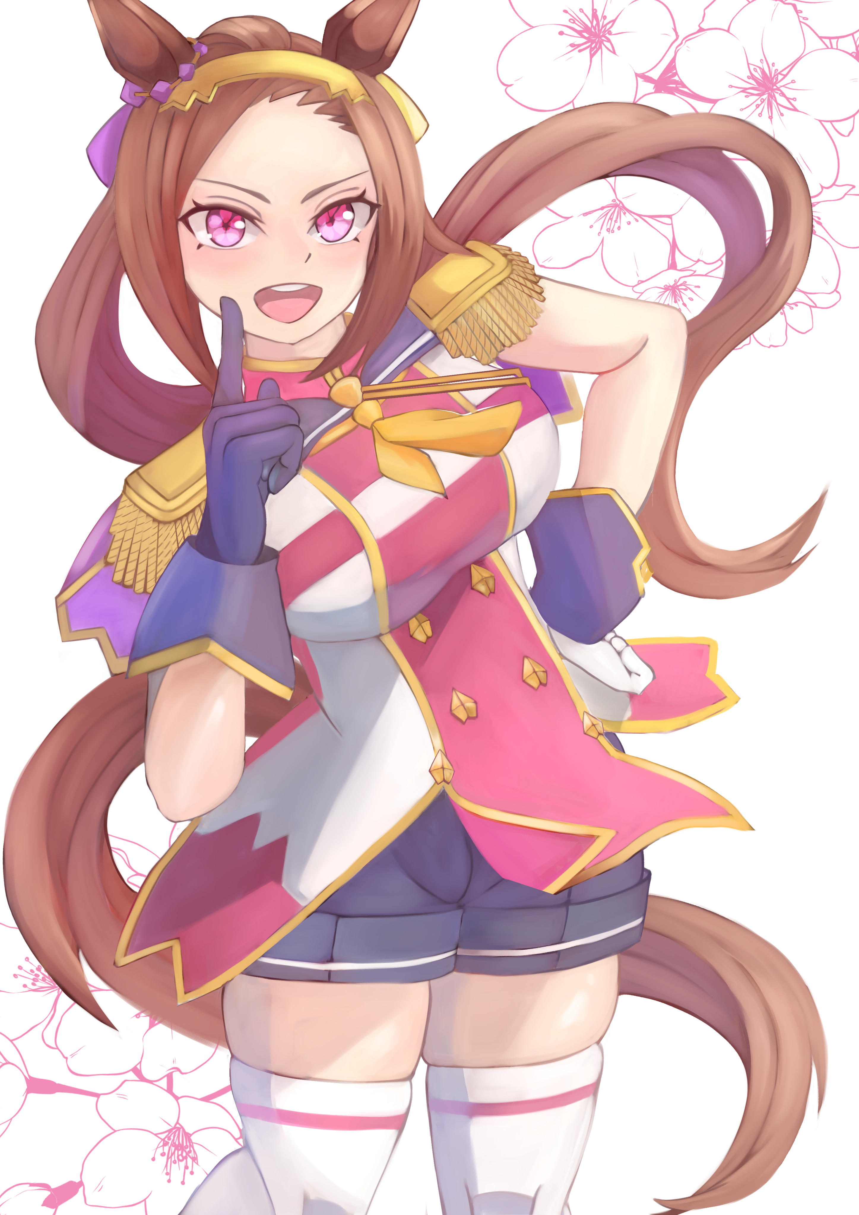 1girlanimal earsasymmetrical glovesblack glovesblue shortsblushbreastsbrown haircheckered clothescheckered shirtear ornamentepaulettesflowerflower in eyeglovesgold hairbandhairbandhorse earshorse girlhorse taillarge breastslong hairlooking at viewermismatched glovesneckerchiefopen mouthponytailpurple eyesshirtshortssingle epaulettesleevelesssmilesolosymbol in eyetailteeththighhighsthighsupper teeth onlywhite gloveswhite thighhighsyellow neckerchiefzettai ryouiki