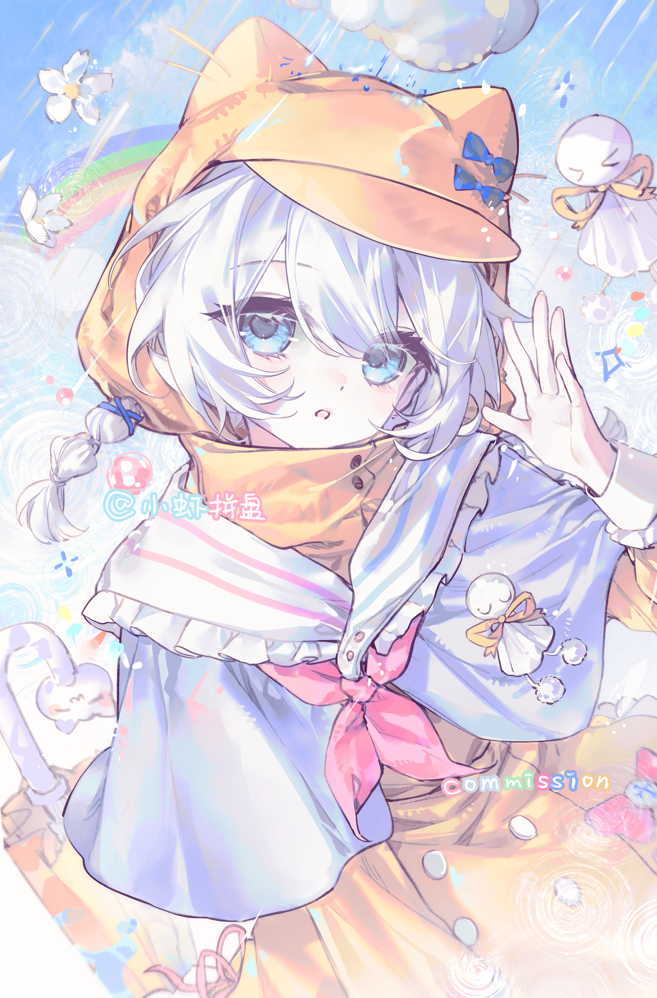 1girlanimal hoodblue bowblue capeletblue eyesblue hairbowbraidcapeletcat hoodcowboy shotdressfrilled sailor collarfrillshair between eyeshair ribbonhand uphoodhood uphooded dresslong hairlong sleeveslooking at viewerneckerchiefopen mouthpink neckerchiefrainribbonsailor collarsoloteruterubouzuumbrellawhite ribbonwhite sailor collarxiao xia pin panyellow dressyellow umbrella
