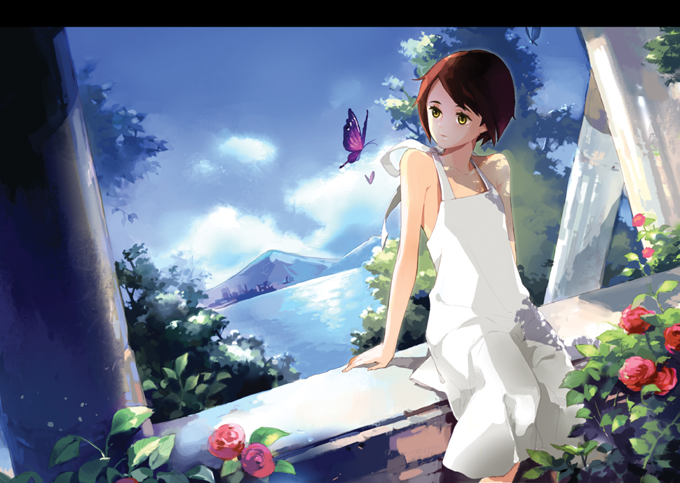 brown hairbugbutterflycityscapeclouddaydressflowerinsectleafplantshort hairsittingskysolowaterwhite dressyellow eyes