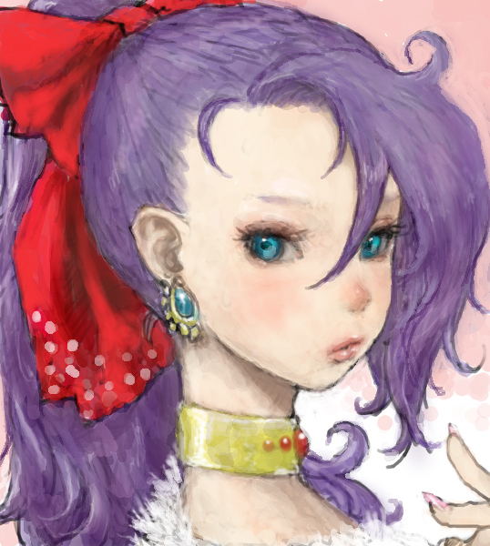 1990s (style)1girlalternate costumeblue eyeschokerearringsfemale focusforeheadhair ribbonjewelrypurple hairribbonsolo