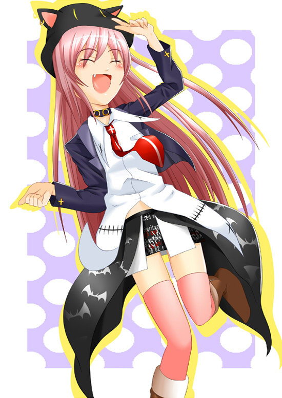 :d1boy1girlalternate costumeanimal earsanimal hatbat (animal)blazerblushbootscat earscat hatchokerclosed eyescrossdancingdemon girlearringsfangfemale focusflat chestgoth fashionhatjacketjewelryleg liftlong hairmidriffminiskirtnecktieopen clothesopen mouthopen shirtpink hairpink thighhighspointingpolka dotshirtskirtsmilesolostandingstanding on one legthighhighsvery long hairzettai ryouiki