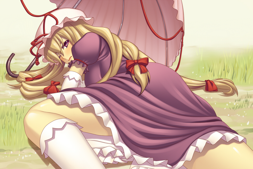 1girlblushbreastsbrown hairdressfemale focushatlong hairlyingnatureoutdoorsplantpurple eyessockssoloumbrellawink
