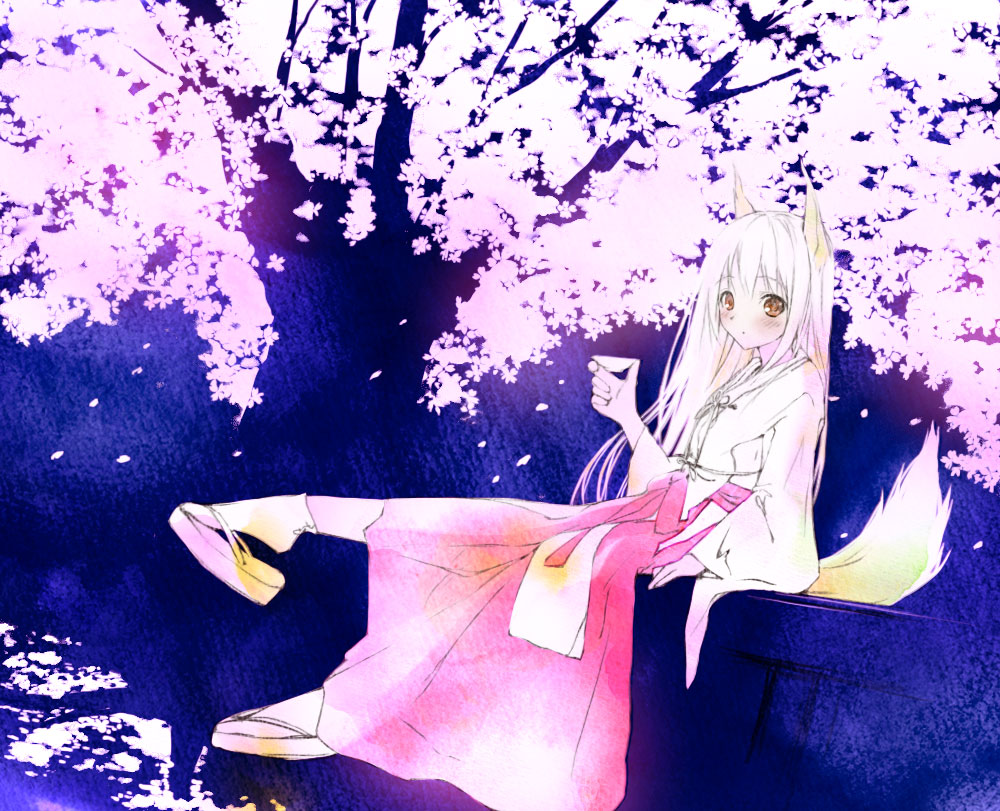 animal earsblushbrown eyescherry blossomsclog sandalscupjapanese clotheslong hairmikosandalsshoe danglesockssolotabitailwhite hairzouri