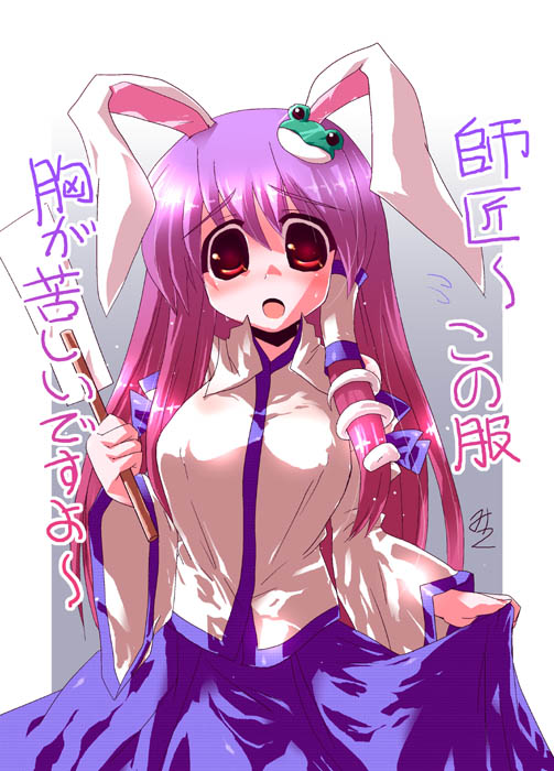 1girlanimal earscosplaydetached sleevesfemale focuskochiya sanae (cosplay)long hairpurple hairrabbit earsred eyesskirt holdsolo