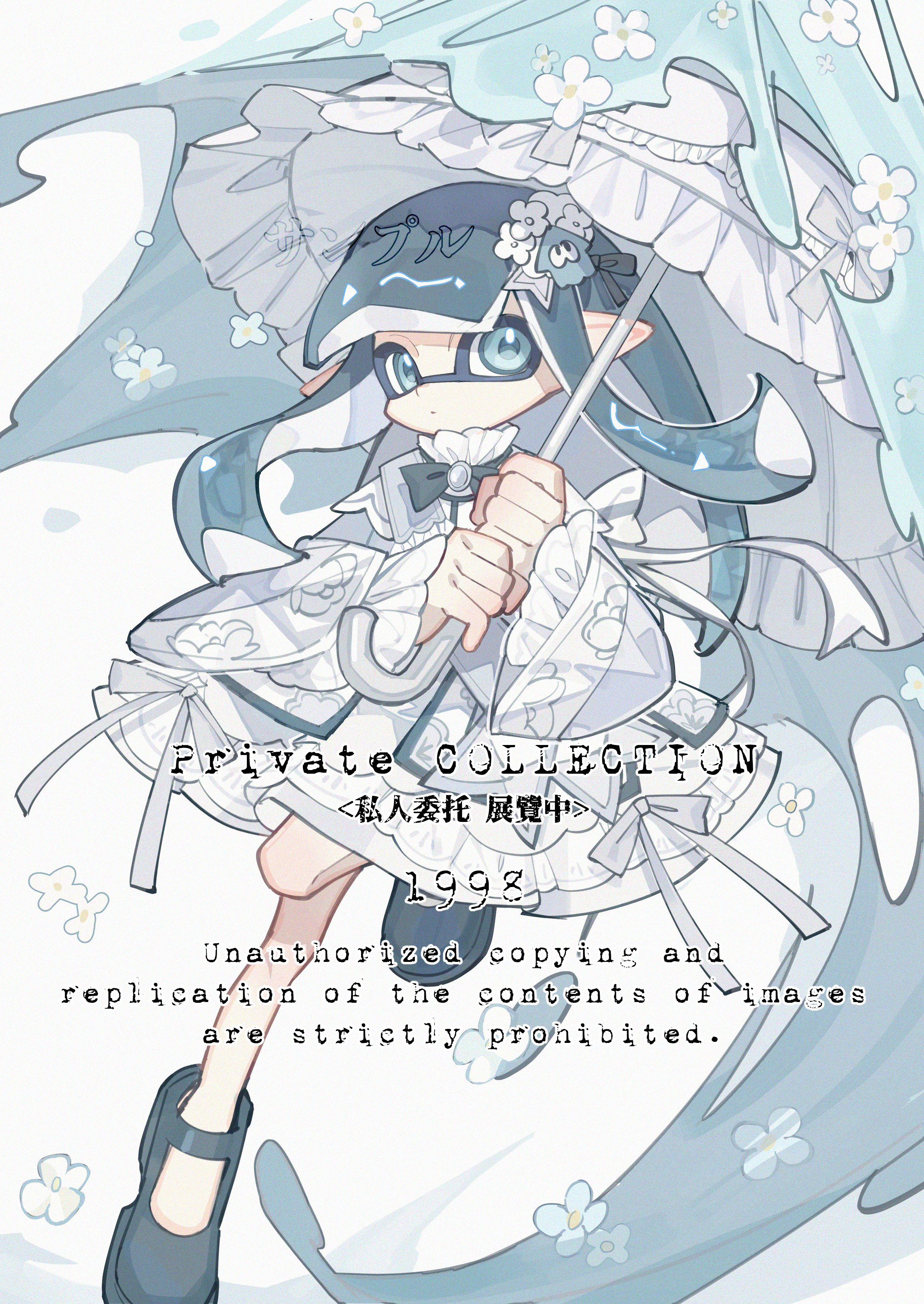 1girlblack shoesblue bowblue bowtieblue eyesblue hairblue umbrellabowbowtieclosed mouthfrilled sleevesfrillsfull bodyholdingholding umbrellainklinglong hairlong sleeveslooking at viewerpointy earsportraitshoessimple backgroundsolostandingstanding on one legtentacle hairumbrellawatermarkwhite background