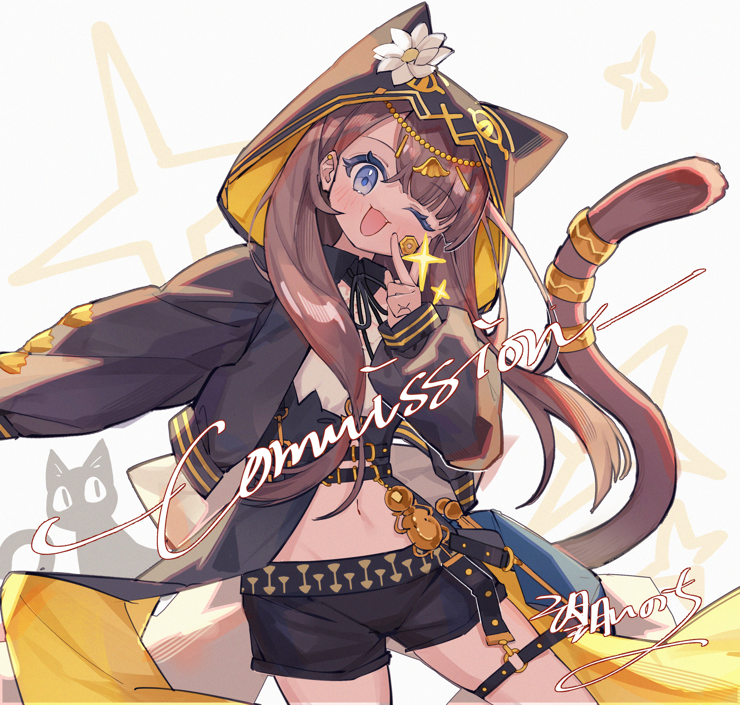 :d1girlanimal hoodartist nameblack hoodieblack shortsblushbrown haircatcat girlcat hoodcat tailcowboy shotfanghand uphoodhood uphoodieindex finger raisedlong hairlooking at viewermidriffnavelo-ringo-ring thigh strapopen clothesopen hoodieopen mouthshortssmilesolosparklestandingtailthigh strap