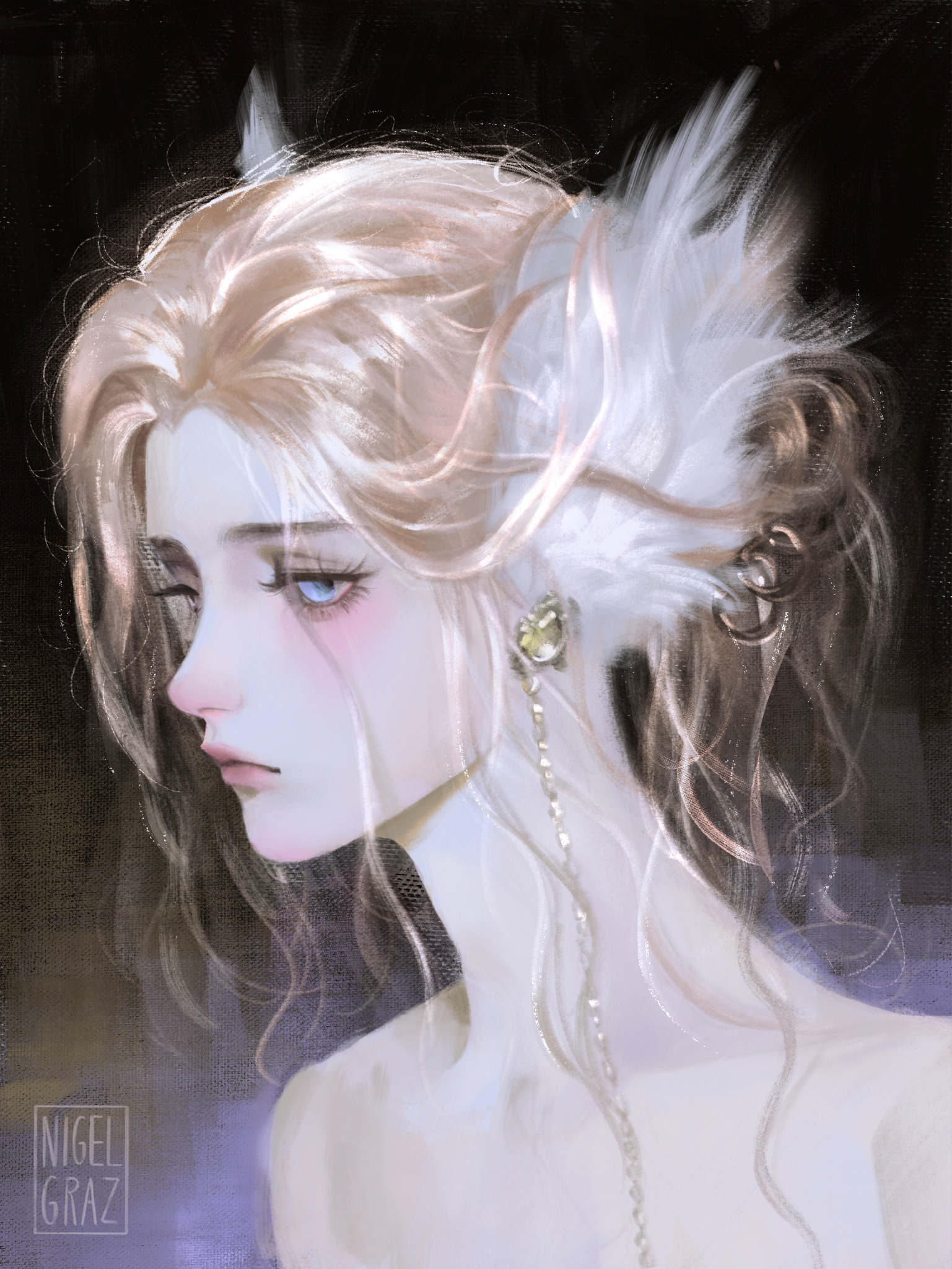 1girlbare shouldersblack backgroundblonde hairblue eyesclosed mouthearringshair ornamentjewelrysolo
