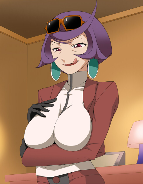 :q1girlbreastscleavageearringsfemale focusfrontier brainglovesjewelrylarge breastslickingnaughty facepurple hairred eyessolosunglassestonguetongue out