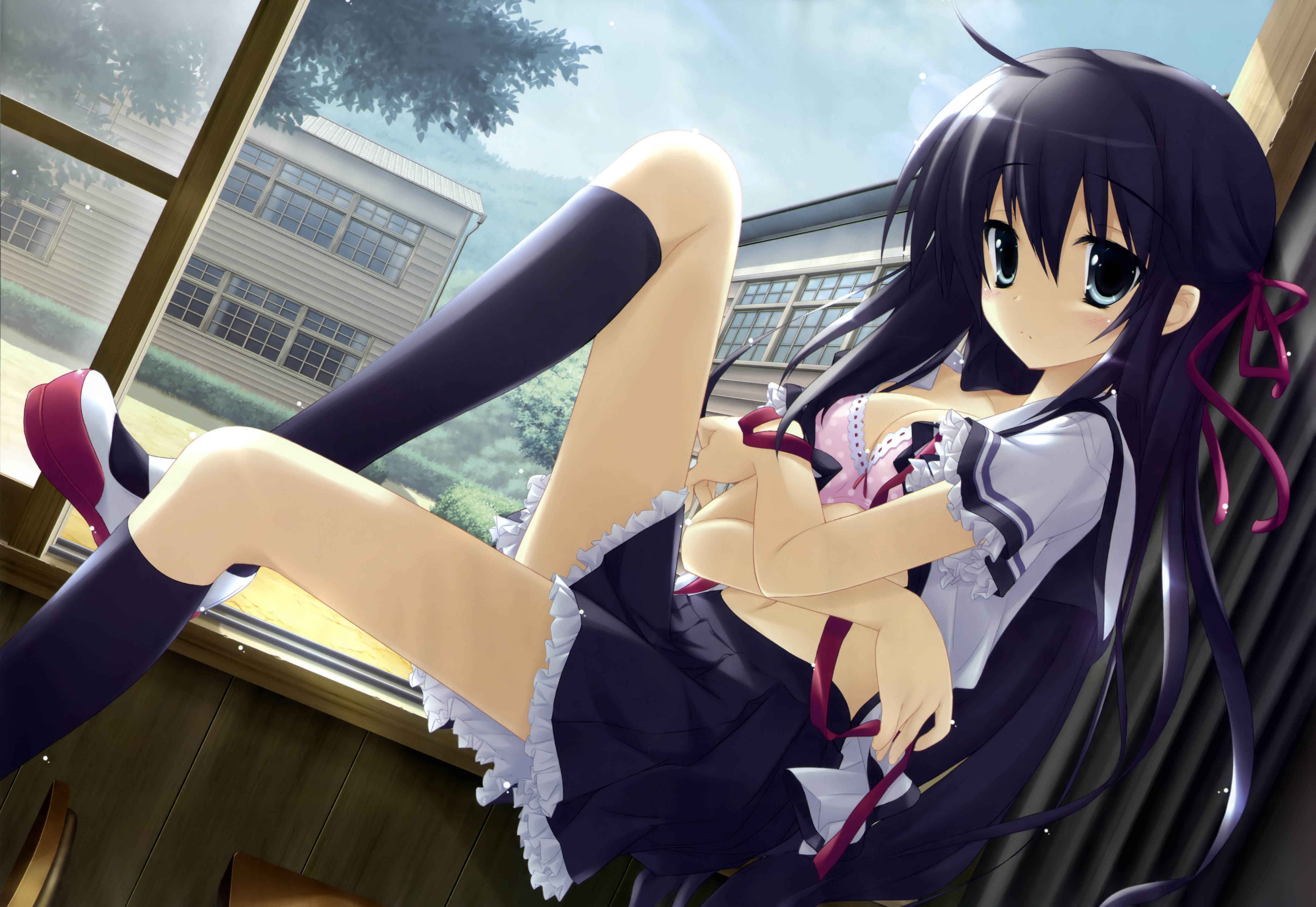 furude rika, higurashi no naku koro ni, tsumihoroboshi-hen, 00s, 1girl, black skirt, blue hair, copyright name, female focus, from behind, looking back, red eyes, school uniform, shirt, short sleeves, skirt, solo, suspender skirt, suspenders, white shirt