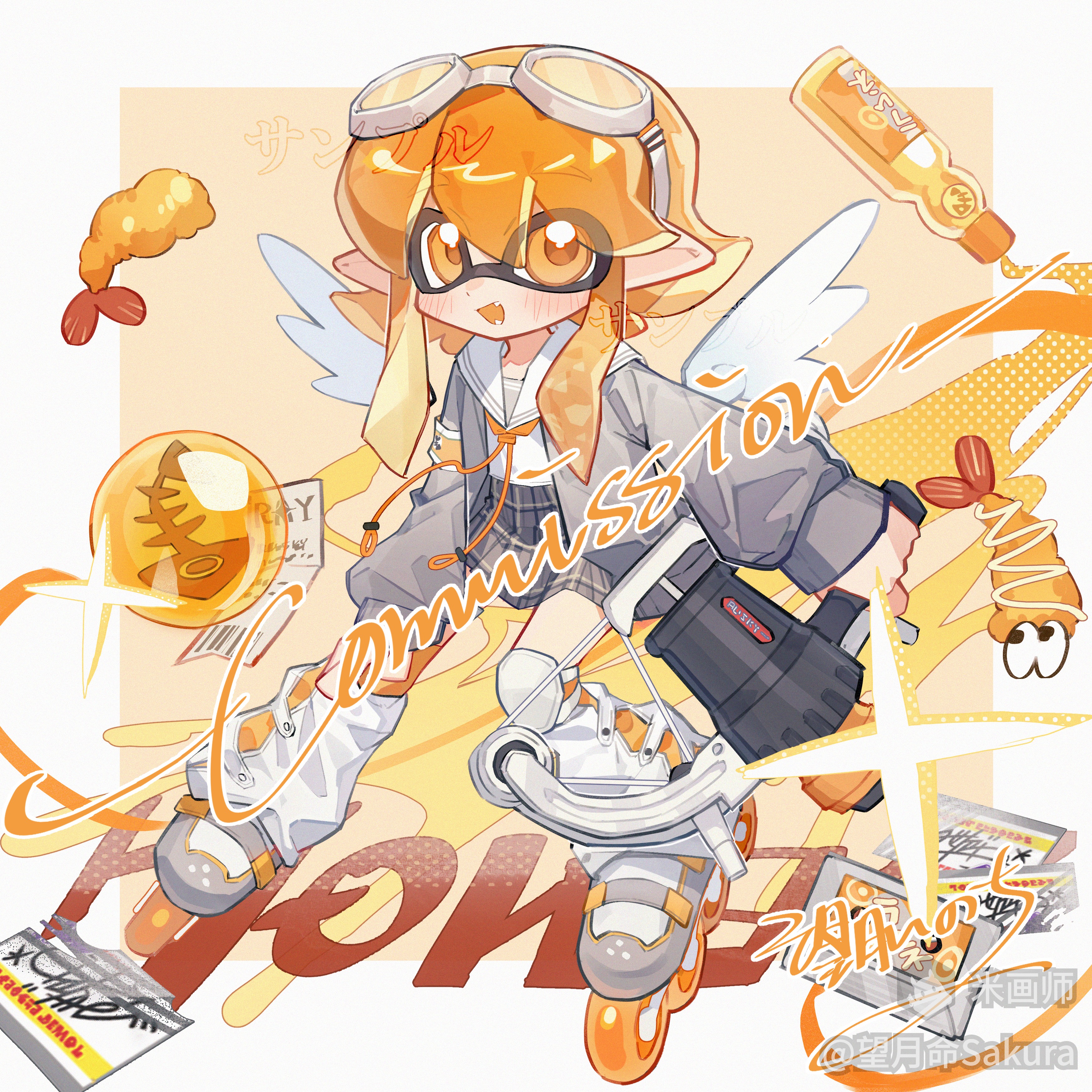 :d1girlartist nameblushborderfangfull bodygogglesgoggles on headgrey jacketgrey shoesgrey skirthair between eyesinklingjacketknee padslong hairlong sleeveslooking at viewermihuashi usernameopen clothesopen jacketopen mouthorange eyesorange hairoutside borderplaid clothesplaid skirtpleated skirtpointy earsroller skatessailor collarschool uniformserafukushoesskatesskirtsmilesockssolostandingtentacle hairwhite borderwhite sailor collarwhite sockswhite wingswingsyellow background