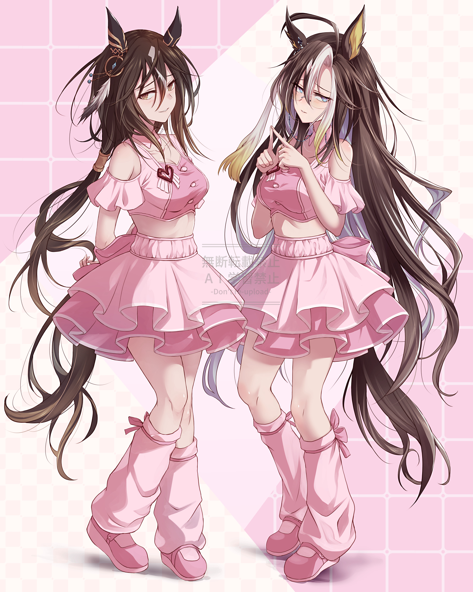 2girlsahogeanimal earsblack hairblue eyesblushbreastsbrown eyesbrown hairbrown tailclothing cutoutcollarbonecropped shirtear coversfull bodyglasseshair between eyeshorse earshorse girlhorse taillarge breastslayered skirtlong hairlooking at viewerloose socksmeni shuki rush-sshu!midriffmulticolored hairmultiple girlsofficial alternate costumepink shirtpink skirtpink socksshirtshoulder cutoutskirtsmilesocksstreaked hairtailwatermarkwhite hair