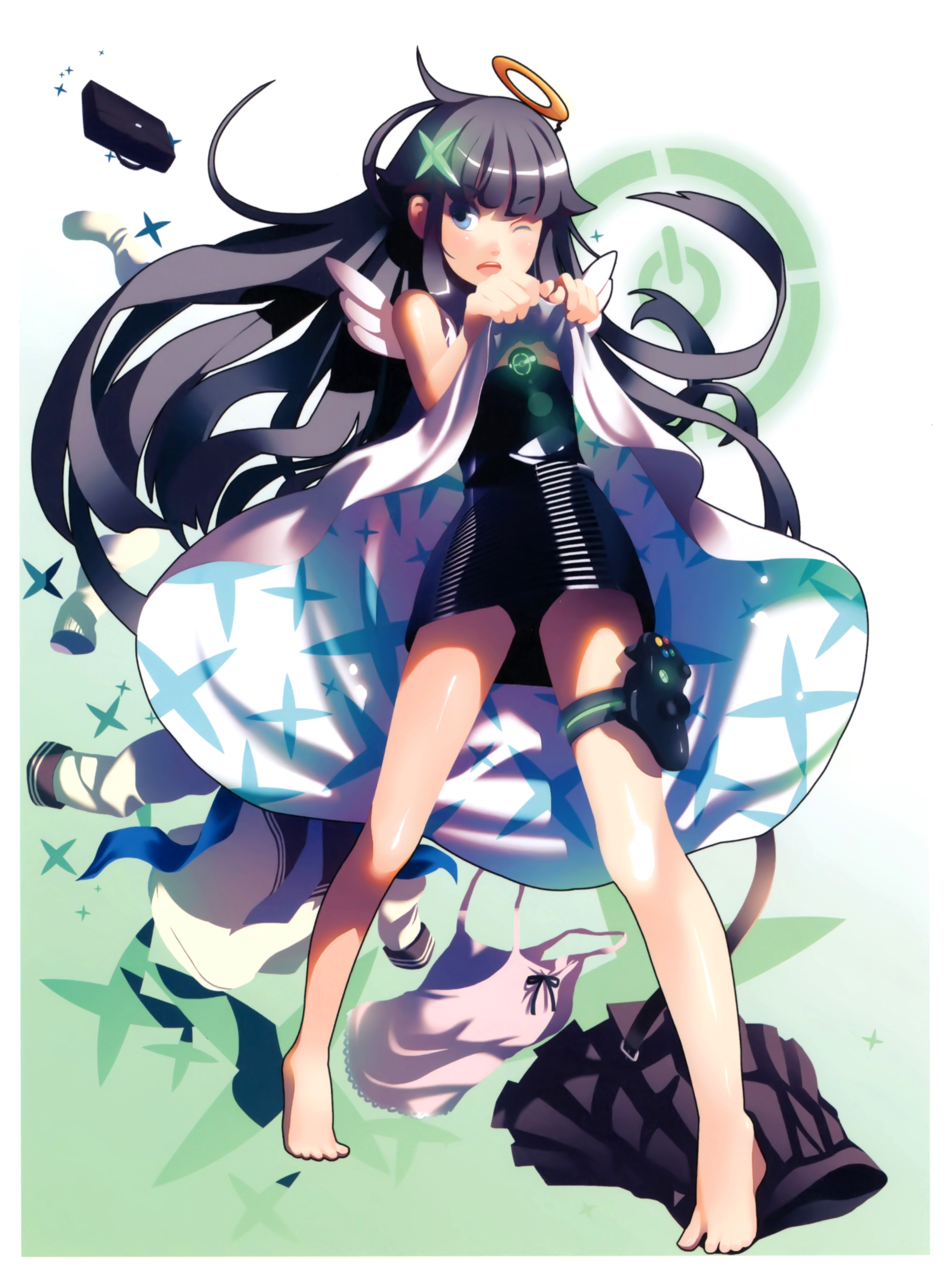 katahira masashi, original, bell, blue eyes, cuffs, green hair, long hair, pointy ears, thighhighs, wrist cuffs, zettai ryouiki