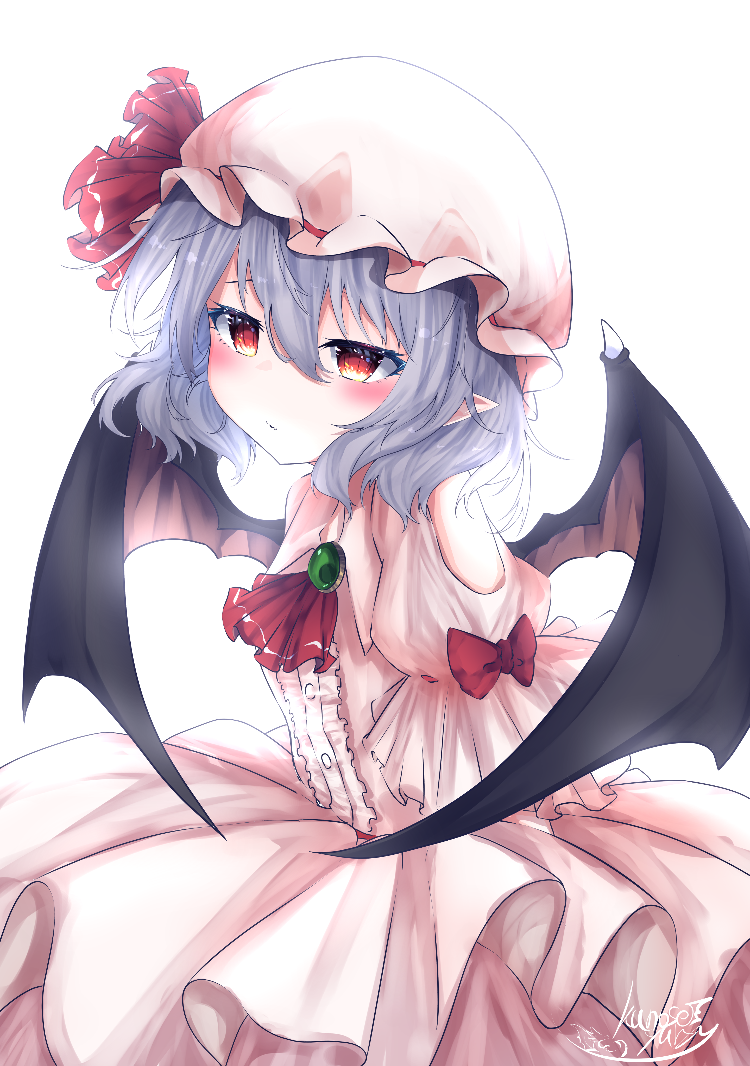 1boy1girlascotbat wingsblue hairblushbowbroochcenter frillsclothing cutoutdressfrilled hatfrillshatjewelrylooking aheadmob cappink dresspink hatpointy earsred ascotred bowred eyesshoulder cutoutsignaturesimple backgroundsolowhite backgroundwings