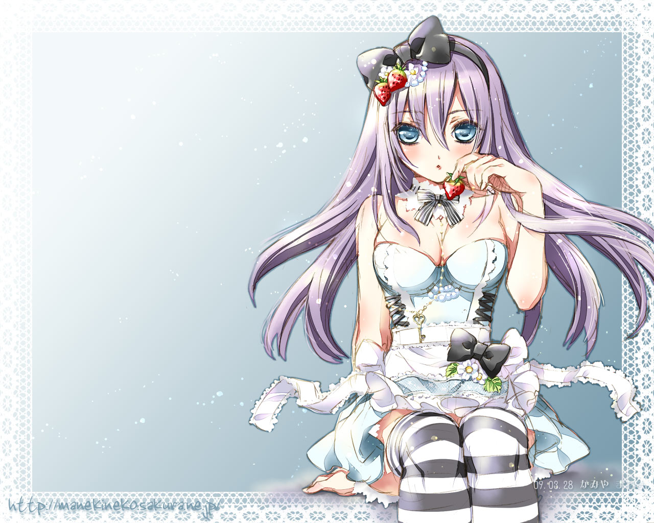 1girlbare shouldersblue eyesdetached collarfemale focusfoodfood-themed clothesfruithairbandlong hairpurple hairsittingsolostrawberrystriped clothesstriped thighhighsthighhighszettai ryouiki