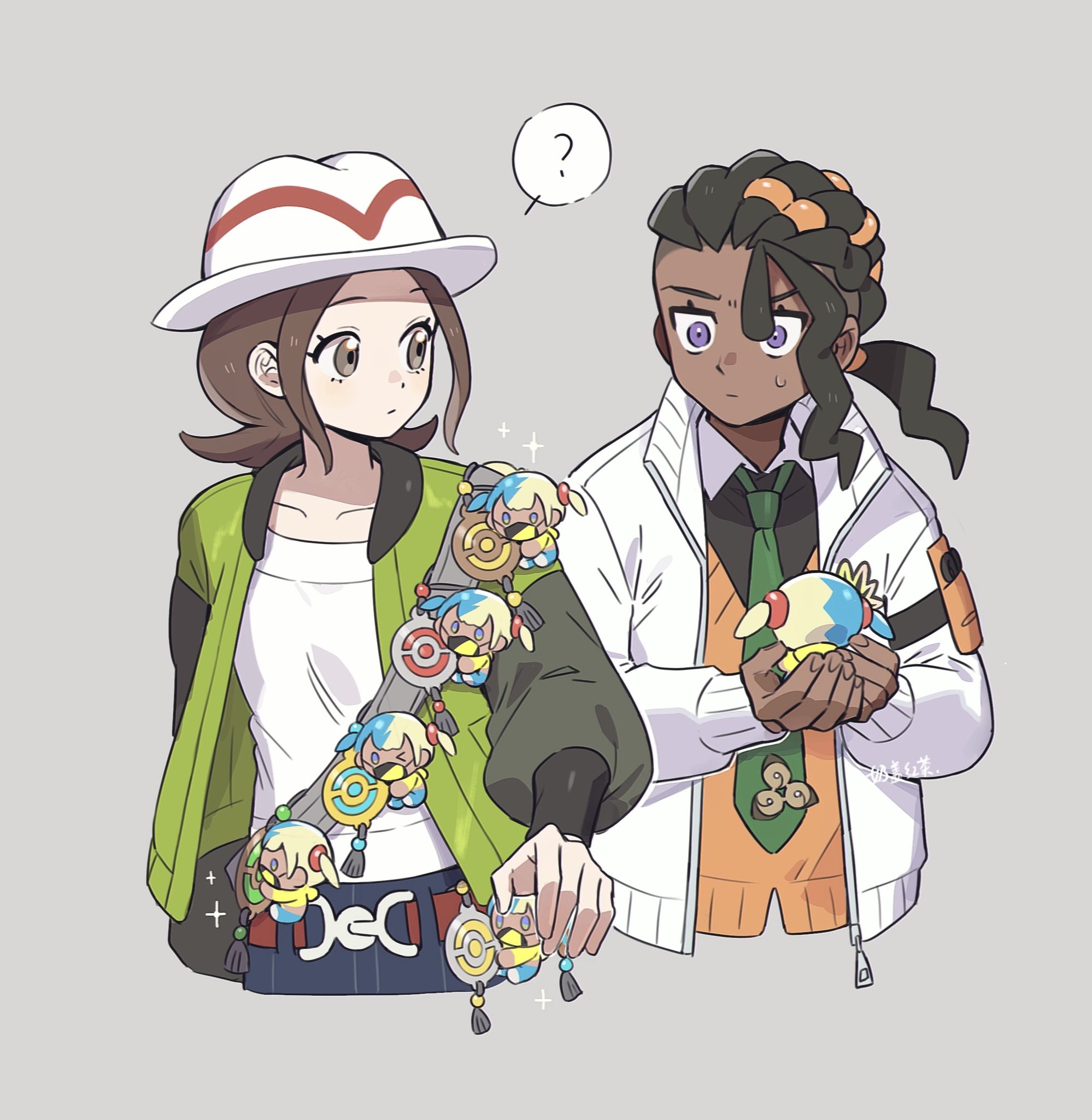 1boy1girlbeltbrown beltbrown eyesbrown haircharacter dollclosed mouthcollarbonecollared shirtdark skindark-skinned maledolleyelashesgreen jacketgreen necktiegrey backgroundhatholdingholding dolljacketlong hairlong sleevesnecktieopen clothesopen jacketorange vestpantspurple eyesshirtspoken question markstrapsweatdropvestwhite hatwhite jacketwhite shirt