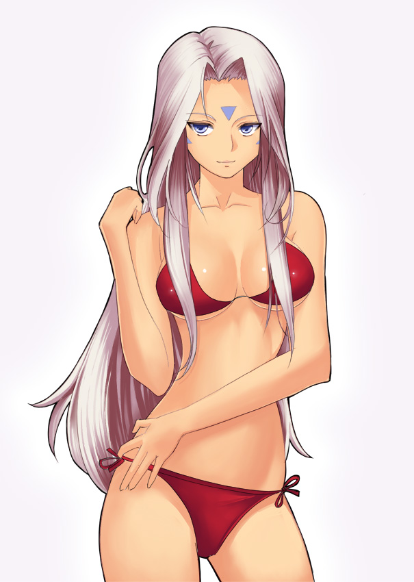 1girlbikiniblue eyesfacial markfemale focusforehead marklong hairred bikiniside-tie bikini bottomsoloswimsuitwhite hair