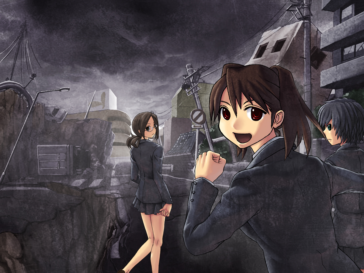 1boy3girlsblazerbrown haircarcityclenched handclouddestructionearthquakefrom behindglassesjacketlooking at viewerlooking backmotor vehiclemultiple girlsoutdoorspleated skirtred eyesruinsschool uniformseriousshort hairskirtskysmilestanding