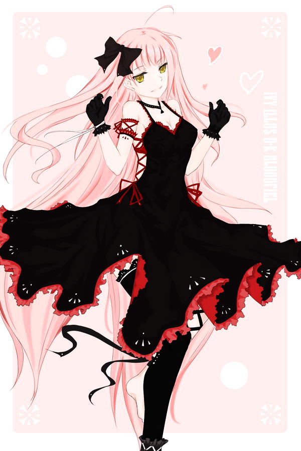 1girlbarefootbowbreastscleavagefemale focushair bowlong hairmedium breastspink hairsolothighhighsvery long hairyellow eyes
